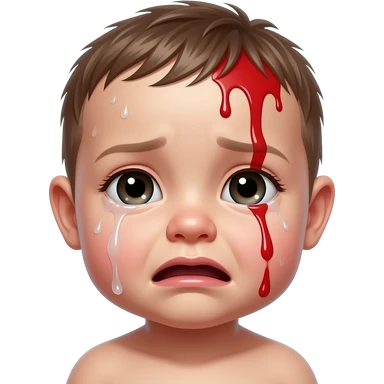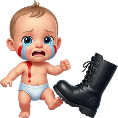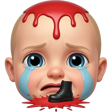 Crying baby with red paint running down face from top being kicked with a black boot emoji