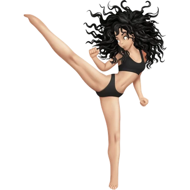 White curvy female with super wavy black hair doing a high kick emoji