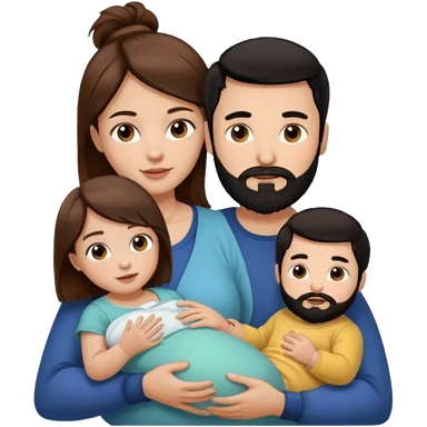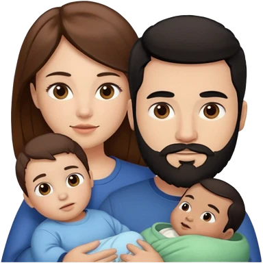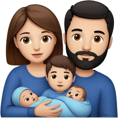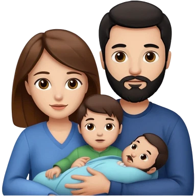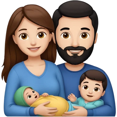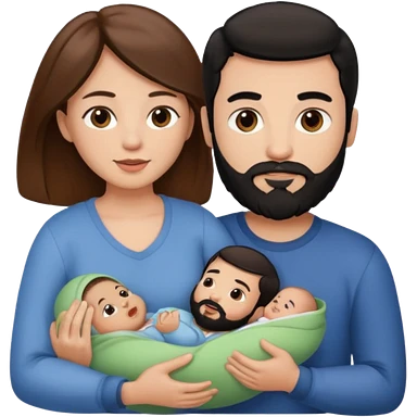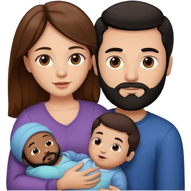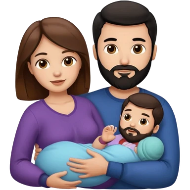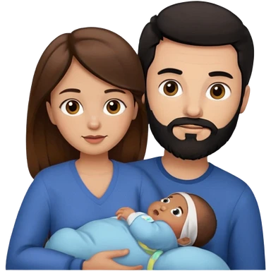 Una mujer con pelo castaño y ojos marrones y un hombre con pelo negro y barba y un bebe emoji