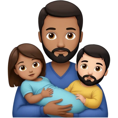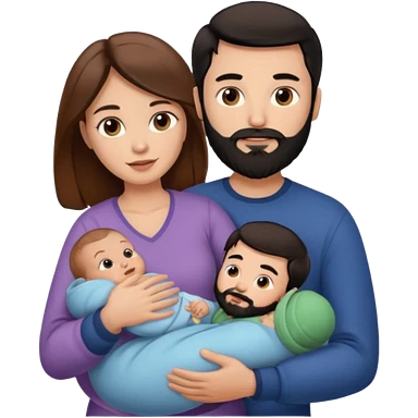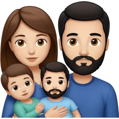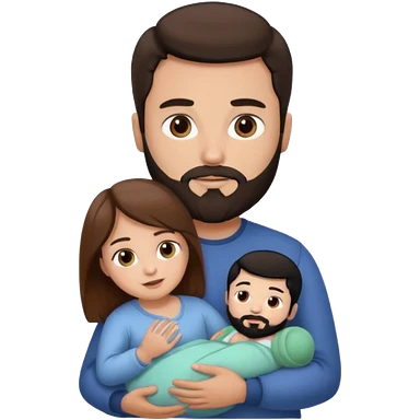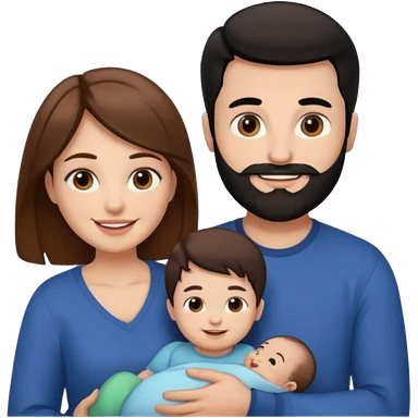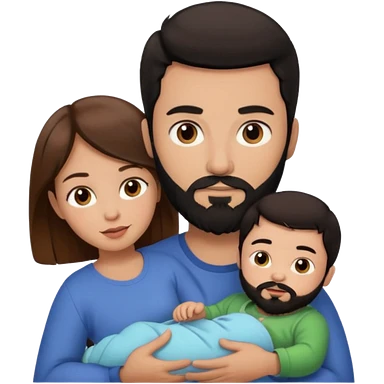 Una mujer con pelo castaño y ojos marrones con un bebé y un hombre con pelo negro y barba emoji