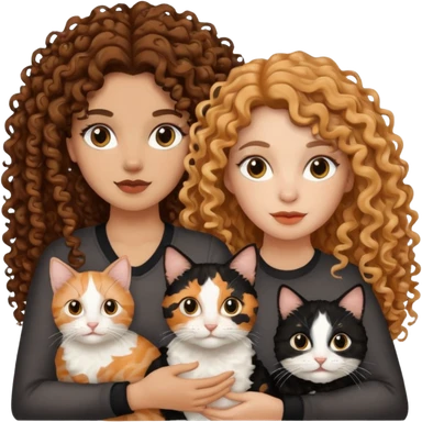 2 mujeres una crespa una de cabello largo y 2 gatos uno negro y otro tres colores emoji