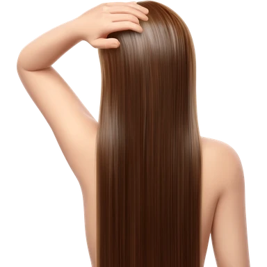 Back view of a woman with long, straight, glossy brown hair, hand gently holding the back of her head. Clean light background, soft studio lighting, sleek haircare ad style, ultra-realistic, high resolution. emoji