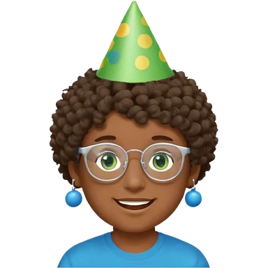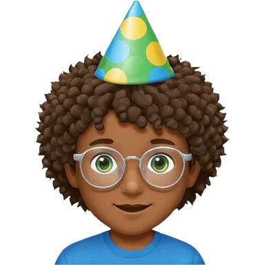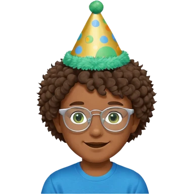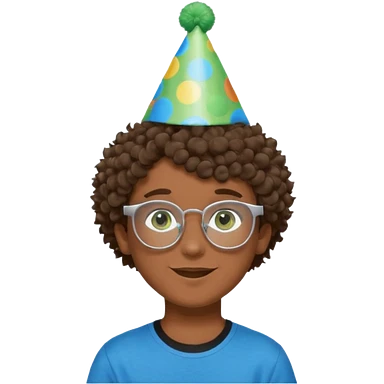 A boy with curly brown hair and green eyes with a happy face, and wear square glasses.He’s also got a full silver birthday party hat on his head with blue pom poms on top of it, and his T-shirt is all black, he wears a little gold circle earrings on his left emoji