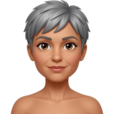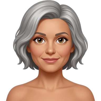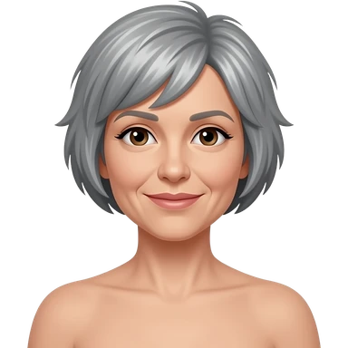 woman 50 years old, nude body, short grey fluffy cut hair, tannes skin and brown eyes emoji