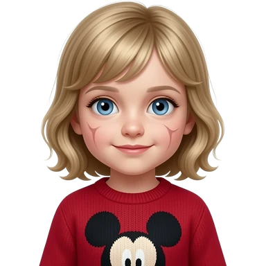 Little girl with blue eyes and dirty blonde hair and a Mickey Mouse sweater emoji