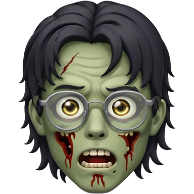 Faça um adolescente zombie com cara de assutado com cortes no rosto, com óculos é cabelos grandes ondulado preto emoji