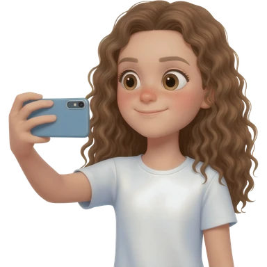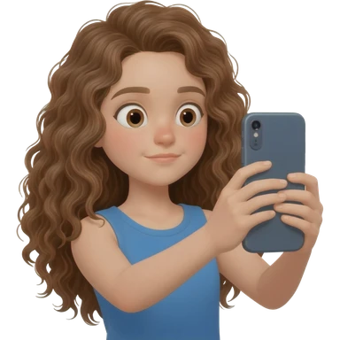 Menina branca,de olhos castanhos claros, com cabelos longos encaracolados gravando vídeo em um iPhone emoji