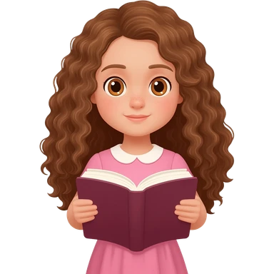 Menina branca,de olhos castanhos claros, com cabelos longos encaracolados vestido rosa lendo a Bíblia emoji