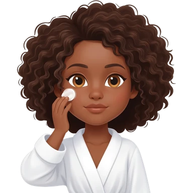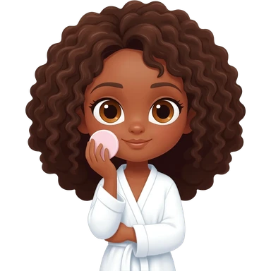 Menina parda,de olhos castanhos claros, com cabelos grandes encaracolados e um roupão branco e cosa fazendo skin care emoji