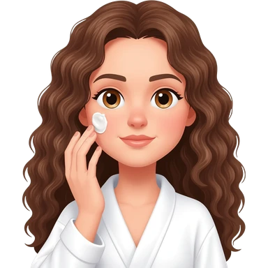 Menina branca,de olhos castanhos claros, com cabelos longos encaracolados e um roupão branco e cosa fazendo skin care emoji