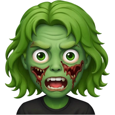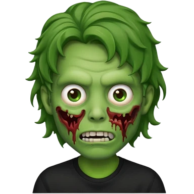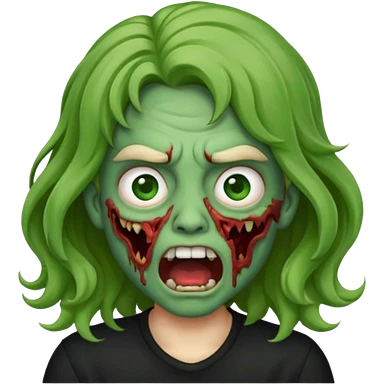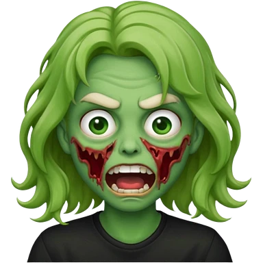 zombi emoji with a wavy medium hair, mouth, nose, green skin, black shirt emoji