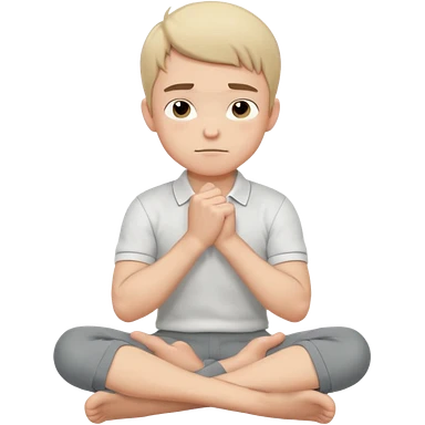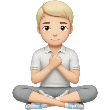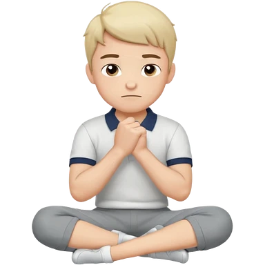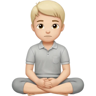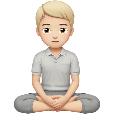 A cartoon young Asian boy with short black hair, light beige skin, and large expressive eyes, wearing a white polo shirt, gray pants, and black shoes. He sits cross-legged on the ground, one fist resting on his cheek, with a closed-mouth smirk. Clean lines, flat colors, solid black background. emoji