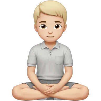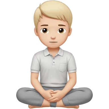 Cartoon boy sitting cross-legged, his fist pressed to his cheek, wearing a white polo and gray pants. He has a smug smirk, eyes looking forward. Clean lines, flat colors, solid black background, vector art, character sheet style. emoji