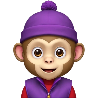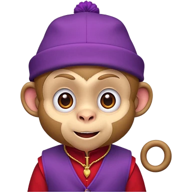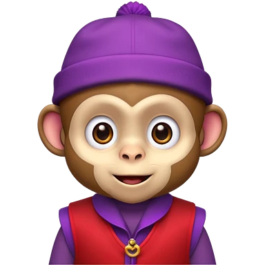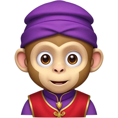 Cute monkey inspired by Abu from Aladdin, big expressive eyes, purple vest, red fez hat, mischievous grin. Emoji-style, bold outlines, bright colors, centered face on transparent background, high quality, vector style. emoji