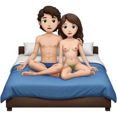 white girl, dark brown long slightly curly hair , skinni but with big breast , septum piercing on nose, beautiful dark gray-blue eyes, showing her foot toes, naked , skinny boy , white skin , light brown hair, brown eyes , white skin , in bed , having date emoji