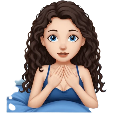 white girl, dark brown long slightly curly hair , skinni but with big breast , septum piercing on nose, beautiful dark gray-blue eyes, naked in bad , feet emoji