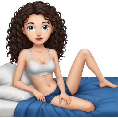 white girl, dark brown long slightly curly hair , skinni but with big breast , septum piercing on nose, beautiful dark gray-blue eyes, showing her foot in bed emoji
