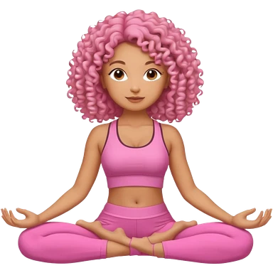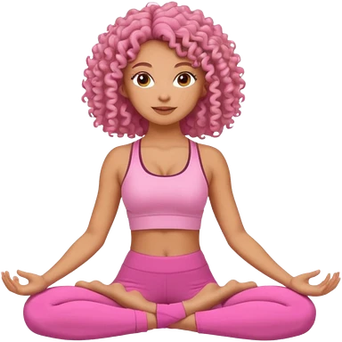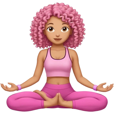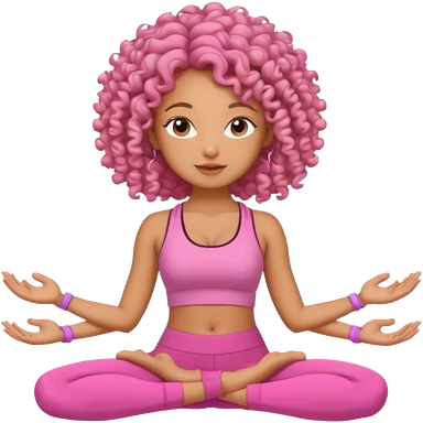 Uma mulher de cabelo cacheado, usando roupa de yoga rosa, em uma posição de yoga bonitinha emoji