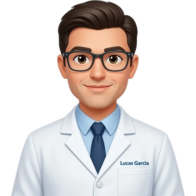 Biomedico com óculos com jaleco branco escrito no bolso lucas garcia emoji