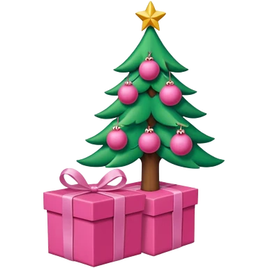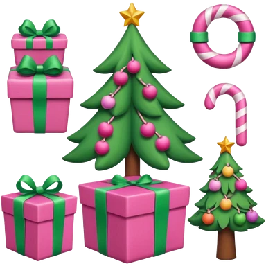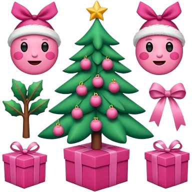 emojis estilo pixar de la cara de santa, arbolito rosa, reno, lazo coquet,bastones de caramelo rosa, caja de regalo rosa, arbolito verde con bambalinas rosa emoji