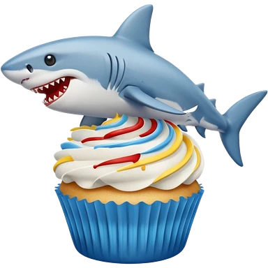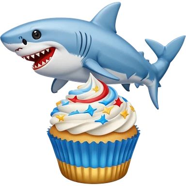 Cupcake with a dog and friendly shark with gloden and silver and blue and red icing emoji