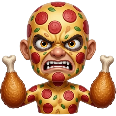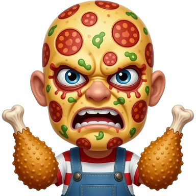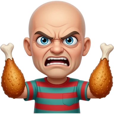 a finger stubby named freddy fried freaker. he looks like a deranged freddy and his arms are fried chicken. he is almost bald and his eyes have pure anger and agony in one package. make him VERY FREDDY, he's not bald yet.. but now he is, look out, he's pizza stairs are giving him pizza skin why? emoji