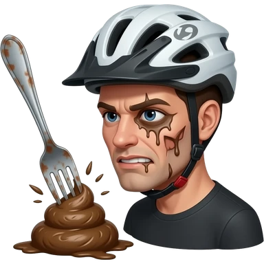the shits stabber, his face is deformed and melted on the left side and he's wearing a crooked bike helmet, he is stabbing poop with a rusty fork emoji
