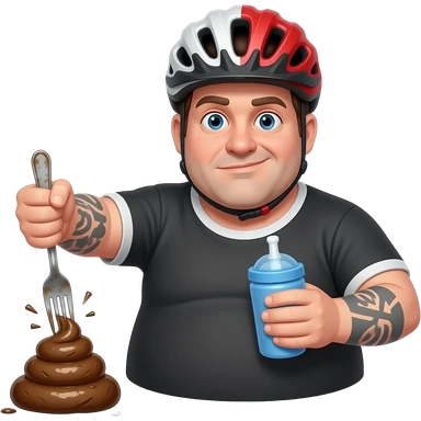 the shits stabber, his face is heavily deformed and melted on the left side and he's wearing a crooked bike helmet, he is stabbing poop with a rusty fork. he is just SO fat and has a sippie cup emoji