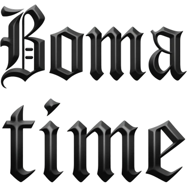 Black goth text saying "BOMA time", the words in top each other emoji