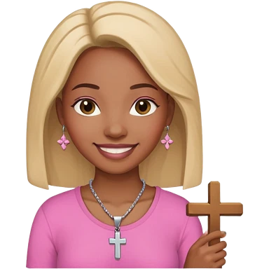 Black woman pink shirt praying with cross necklace in hands emoji