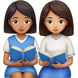 two asian girls black hair on the bed pink and yellow top reading blue books emoji