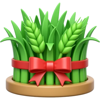 Minimal clean background. A 3D emoji-style samani (green wheat grass) tied with a red ribbon in the middle. Fresh bright green blades, soft glossy texture, rounded base plate. Apple emoji style, soft lighting, simple centered composition with negative space emoji