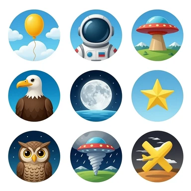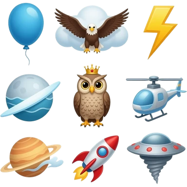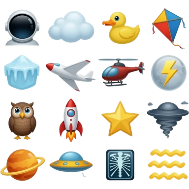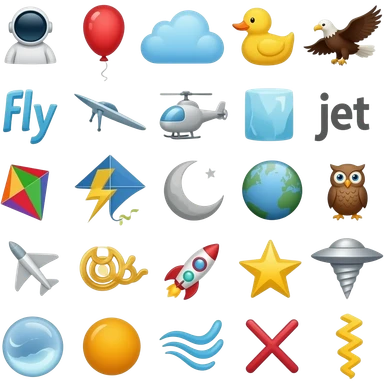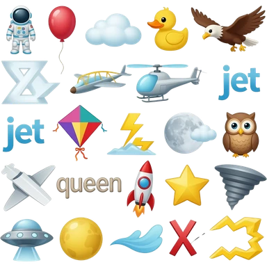 alphabet: astronaut, balloon, cloud, duck, eagle, fly, glider, helicopter, ice, jet, kite, lightning, moon, Neptune, owl, plane, queen, rocket, star, tornado, ufo, Venus, wind, x-rays, yellow, zigzag emoji