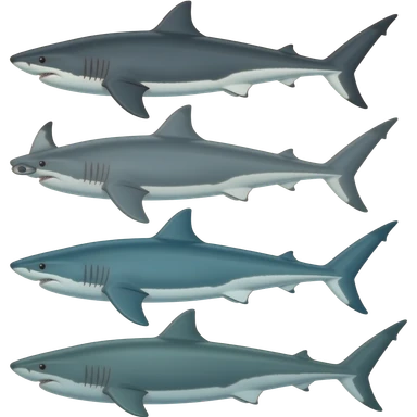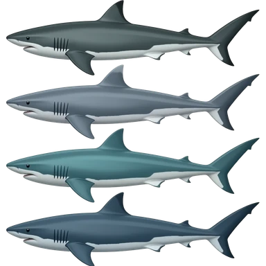 4 sharks: Tiger shark, hammerhead shark, thresher shark, and greenland shark emoji