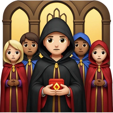 traitor tv show, person wearing dark green cloak with hood up who looks like claudia winkleman orange skin tone and thick black fringe emoji
