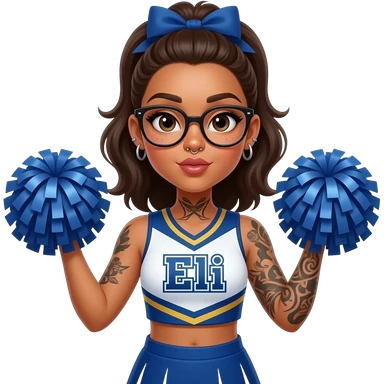 tan girl with glasses, eyebrow piercing and septum, with tattoos on her throat and arms, and long hair, wearing a cheerleader outfit that says “Eli” emoji