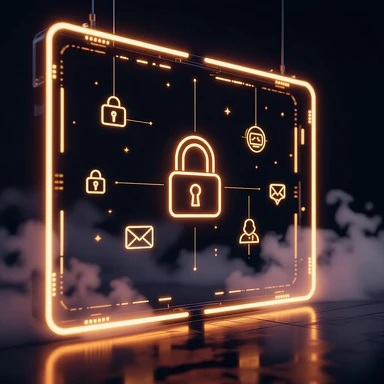 Prominent neon lighting, glowing edges, soft digital mist, dramatic shadows, floating security icons, and subtle golden highlights. Ultra-detailed, photorealistic, clean 16K look with bold, visible lighting. emoji