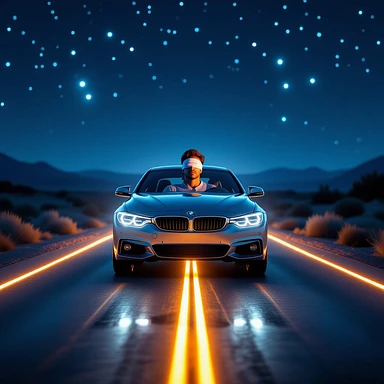 A car driving on a glowing road with a blindfolded man sitting inside. emoji