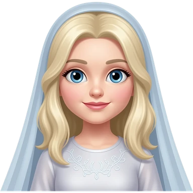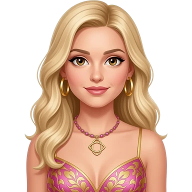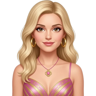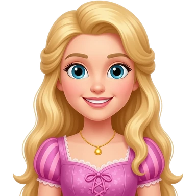 A blond hair blue eyes emoji that is her in a pink dress with curled hair. emoji
