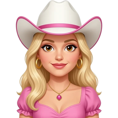 A blond hair brown eye women with a white cowgirl hat with pink and a cute pink dress and gold, hoops, and a cute pink neck necklace emoji