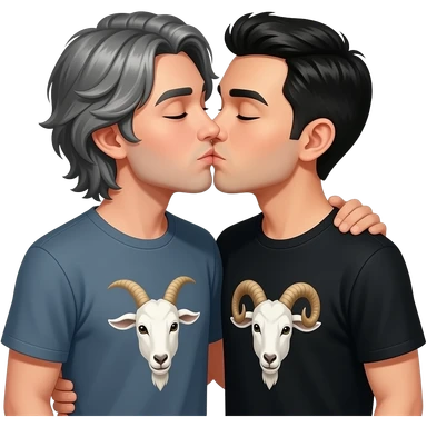 Two men with goat tee kissing passionately, one with a goat tee medium growth and gray hair and the other guy black hair with a black goat tee emoji