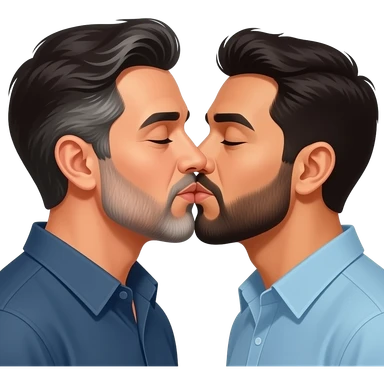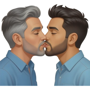 Two realistic Latino men with beards kissing passionate, both with beards and one with gray hair. The one with dark beard make it with spiky gel hair emoji