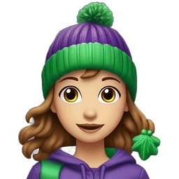 Girl with brown hair and green eyes in front of beautiful Christmas tree in new york city celebrating christmas and wearing a purple beanie emoji