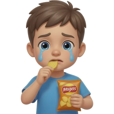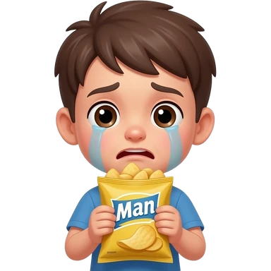 A crybaby boy, eating a bag of man chips emoji
