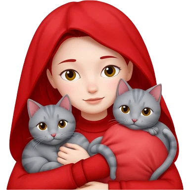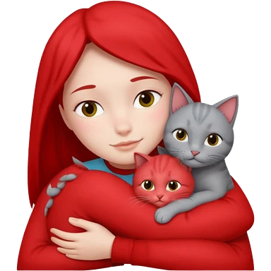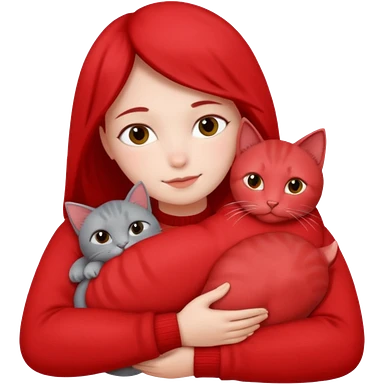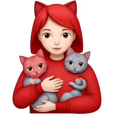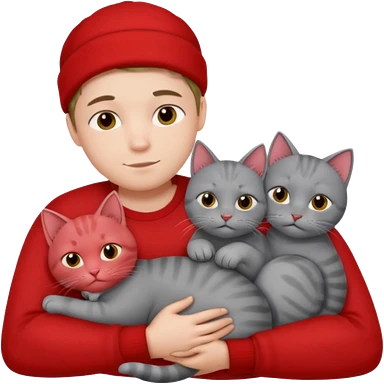 Make 20 gray cats cudling a person wearing all red emoji