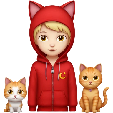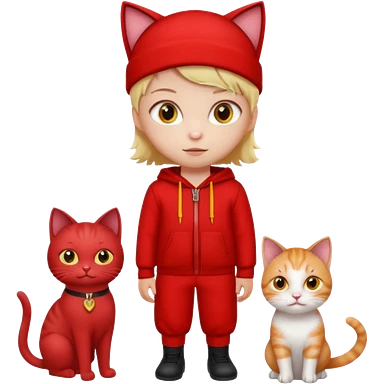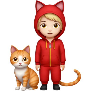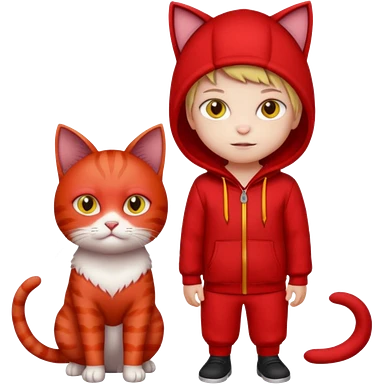 There is a kid wearing all red. Next to him there is a cat that has a red cat outfit and the cat has yellow eyes emoji