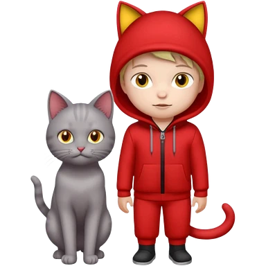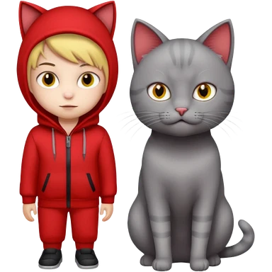 There is a kid wearing all red. Next to him there is a gray cat that has a red cat outfit and the cat has yellow eyes emoji