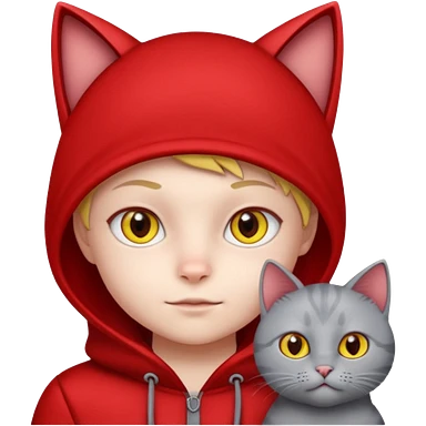 There is one 8 year old boy wearing a red and black hoodie say I heart cats he’s blond he has red Jordan’s and Hess wearing black pants he’s next to his only gray cat with yellow eyes emoji