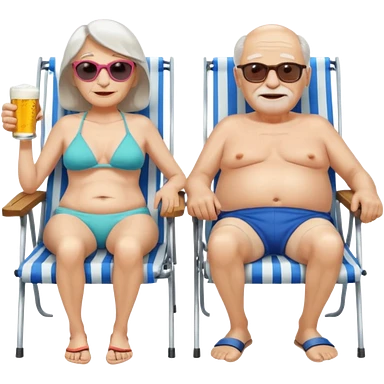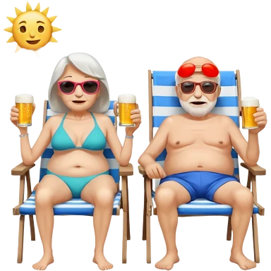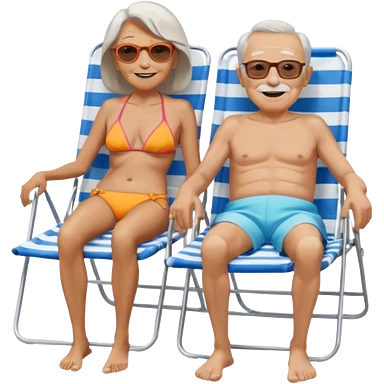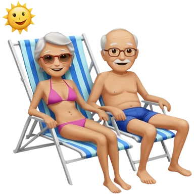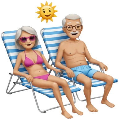an emoji that shows elderly one very slim woman in bikini and one man with dickbauch in bath shorts, both are retired and are lying in sun-chairs at the beach to recover from retiring-stress emoji