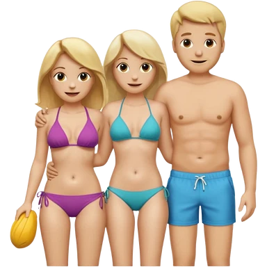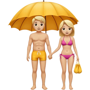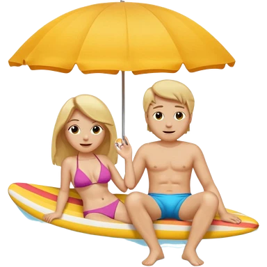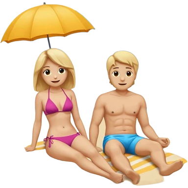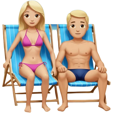 Ein Emoji, 2 personen am Strand: die Frau sehr schlank mit mittellangem, blondem Haar im Bikini, der Mann mit dickem Bauchz in Badeshorts. Beide sind im Ruhestand und liegen entspannt in Liegestühlen, um sich vom Stress des Rentnerlebens zu erholen mit sonnenschirm emoji